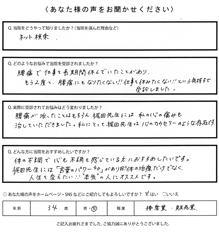 梶田先生には「言葉のパワー」があります! ▶︎腰痛 2022.10.28 34歳 / 女性 / 腰痛/ 肩こり 腰痛で仕事を長期間休んでいたことがあり、もう二度と腰痛になりたくない!仕事を休みたくない!と言う気持ちでネット検索で当院を知り受診しました。 腰痛が治った事はもちろん、梶田先生には私の心の痛みも治していただきました。私にとって梶田先生は心のカウンセラーのような存在です。 体の不調で心も不調を感じている方にお勧めしたいです。梶田先生には「言葉のパワー」があります!体の治療だけでなく人生を変えたい!本気の人にオススメです。