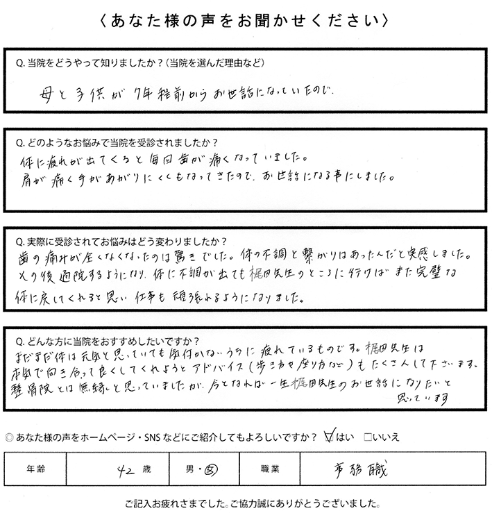その後通院するようになり、体に不調が出ても村田先生のところに行けばまた完璧な体に戻してくれると思い仕事も頑張れるようになりました。