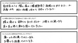 学生時代にスポーツをしていて膝が痛くないりオスグットと診断されました。今でも膝のお皿のしたが痛くなり、骨が出ている感じがします。仕事にも影響がありネットを見て梶田先生に診て頂きました。