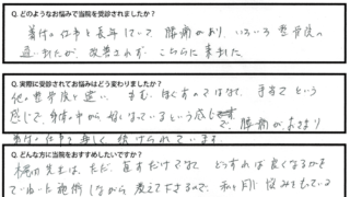 腰痛で仕事を長期間休んでいたことがあり、もう二度と腰痛になりたくない!仕事を休みたくない!と言う気持ちでネット検索で当院を知り受診しました。